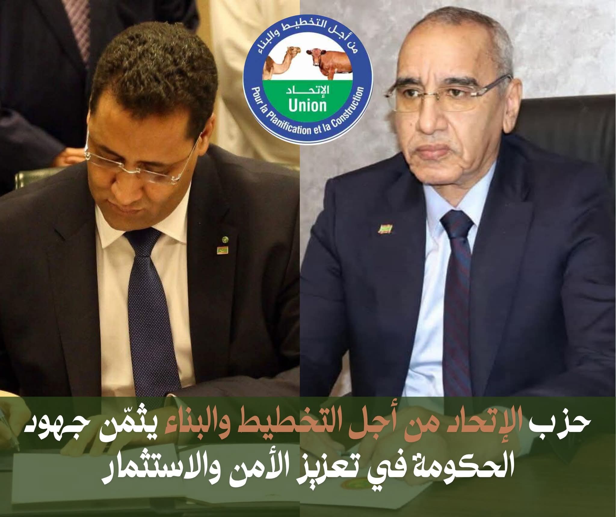 يتابع حزب الاتحاد من أجل التخطيط والبناء باهتمام واعتزاز الجهود الحكومية المتواصلة في سبيل بناء دولة قوية وآمنة، وترسيخ قواعد اقتصاد وطني متنوع ومستدام، تحت القيادة الرشيدة لفخامة رئيس الجمهورية السيد محمد ولد الشيخ الغزواني.